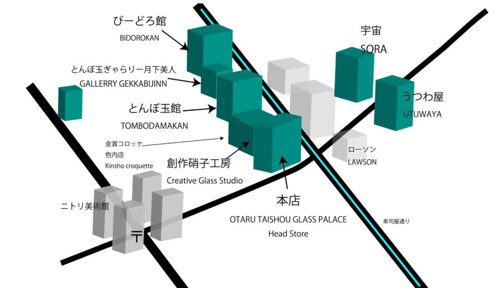 小樽大正硝子館では、とんぼ玉館の他に様々な硝子製品を扱うお店や、