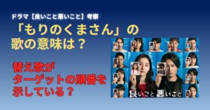 【良いこと悪いこと】「もりのくまさん」考察!ターゲットの順番?ミスリード? どうも!月見です! 始まりましたね~!今期はこのドラマに期待しています。 【良いこと悪いこと】 考察系ドラマは見ていて色々推理できるのでドラマのストーリーと併せ...