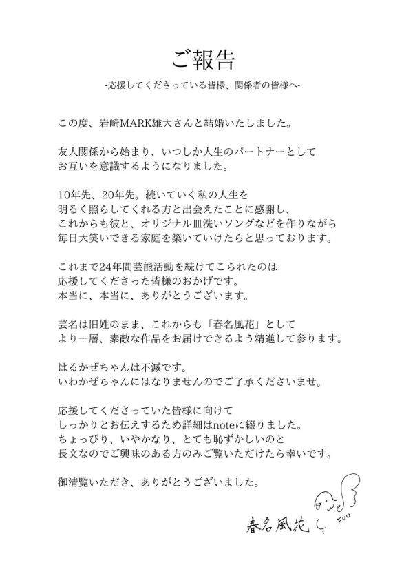 今回は、2025年6月14日に女優・春名風花さんとの結婚を発表した