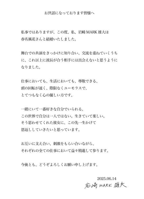 2025年6月14日に岩崎MARK雄大さん、春名風花さんそれぞれから