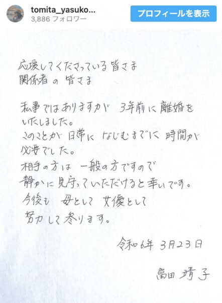 そんな富田靖子さんですが、2007年に結婚し、2021年に離婚したことを発表しています。